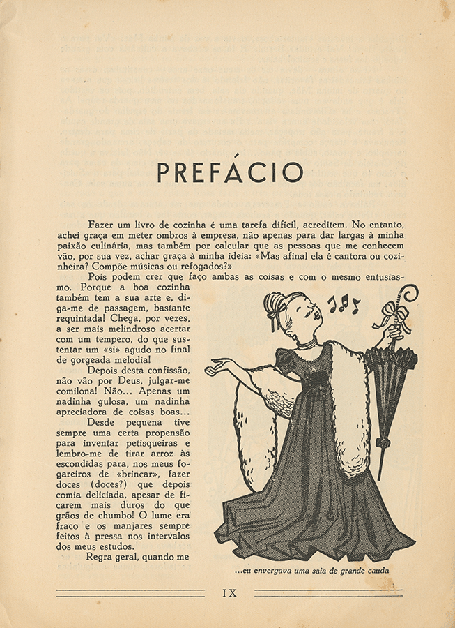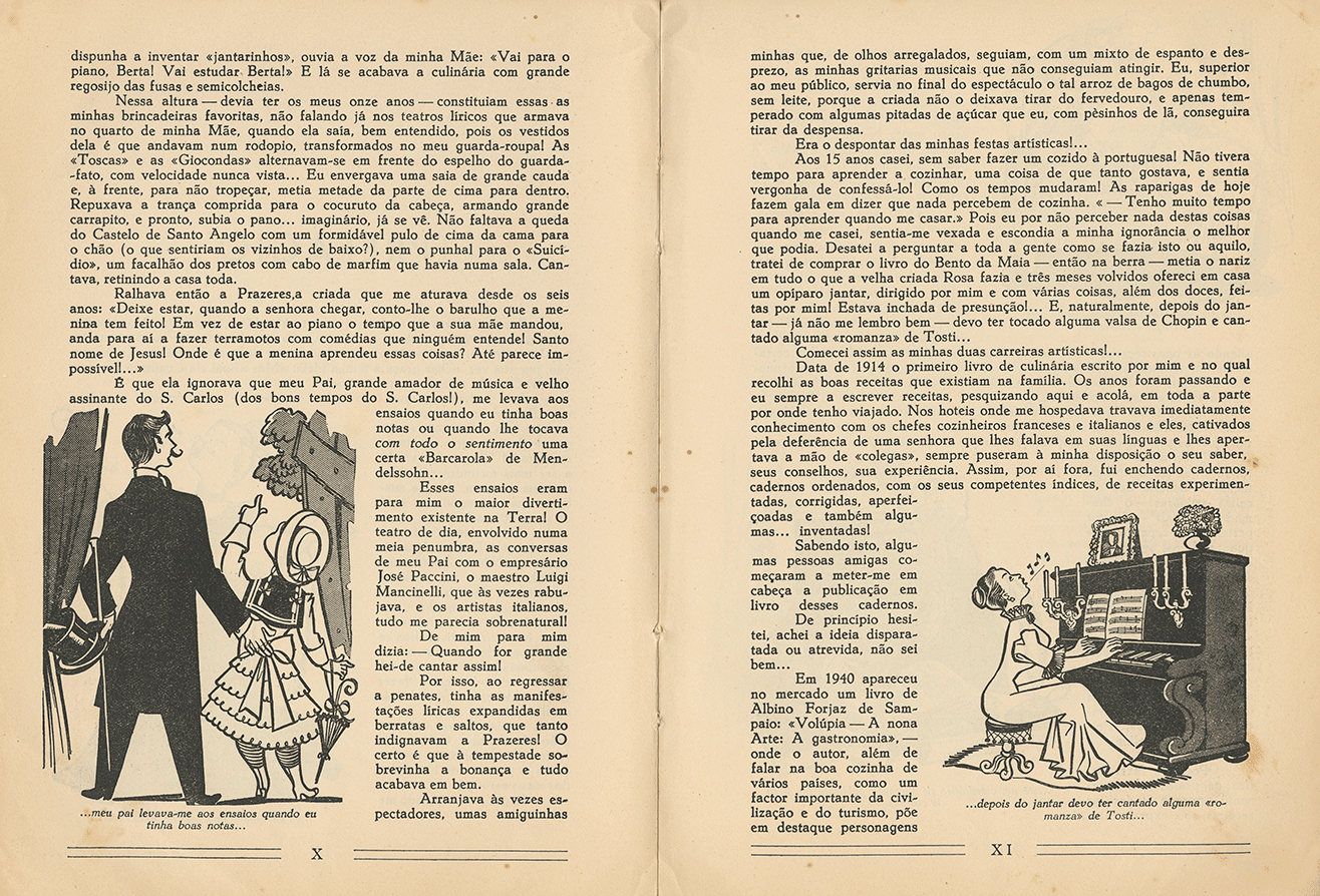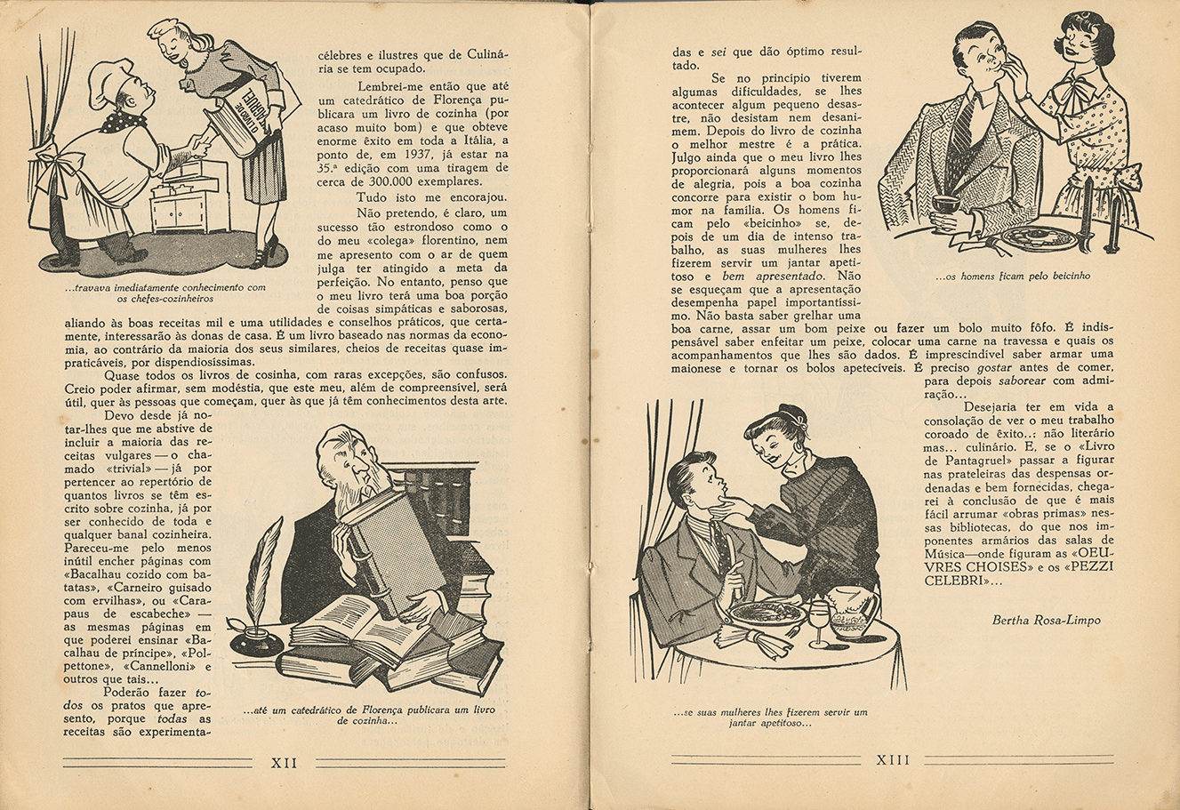 Seguem‑se os prefácios, primeiro o da autora, depois o de amigos por ela escolhidos. Atentemos nas palavras de Berta Rosa Limpo, uma vez que visam testemunhar, na primeira pessoa, a relação (inesperada, mas íntima) de uma artista do canto e do piano, senhora e dona de casa de boas famílias, com uma arte igualmente requintada, ainda que subvalorizada (ou mesmo menosprezada), a arte da (boa) cozinha. Escritas num registo de proximidade com as leitoras, essas palavras destinam‑se a cativá‑las pelo retrato que, num discurso descontraído, bem‑humorado e repleto do glamour, apresentam da autora e da obra. O público leitor, como sempre, é um coletivo feminino, que se revê no modelo de vida da escritora ou a ele aspira. De menina curiosa, criativa e aventureira – que na ausência da mãe brincava aos teatrinhos líricos e servia às amiguinhas umas “petisqueiras” confecionadas com produtos surripiados da farta despensa – Berta muito cedo (com apenas 15 anos) assume o papel de esposa e dona de casa, inexperiente é certo, mas resoluta em tornar‑se uma anfitriã afamada também pelo requinte das suas receções. A biografia que faz desses anos de aprendizagem empenhada e voluntariosa dos segredos da cozinha revela a harmonia que, neste domínio como noutros, deve haver entre conhecimento teórico e prático. É dessa sua propensão natural para acumular saber com metodologia que nasce, cedo (em 1914, aos 20 anos de idade), a Berta autora de livros de receitas. A escrita, conforme a própria revela, é fruto do seu trabalho de salvaguarda do património culinário familiar (composto pelas “boas receitas que existiam na família”, p. XI), do seu labor de colecionista (na recolha de receitas pelos lugares por onde viajava, sendo que o seu elevado nível social a colocou em contacto com a alta cozinha estrangeira então mais prestigiada, a francesa e a italiana) e da criatividade do seu génio. É com uma pitada de orgulho que Berta Rosa Limpo revela o rigor e método dessa tarefa de pesquisa (p. IX):